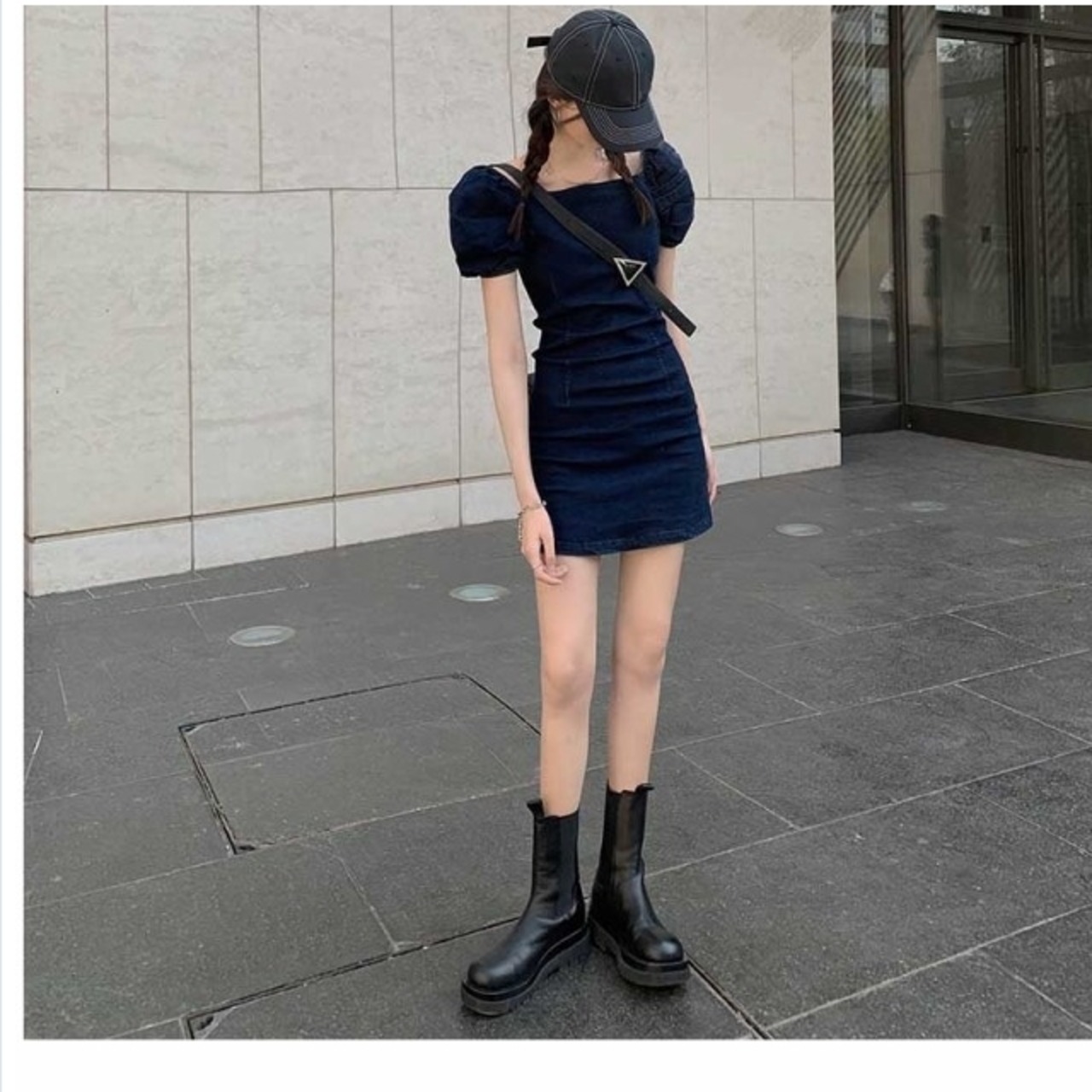 クラシカル ワンピース ワンピース デニムワンピ ミニ丈 タイト パフスリーブ オルチャン 韓国ファッション プチプラ