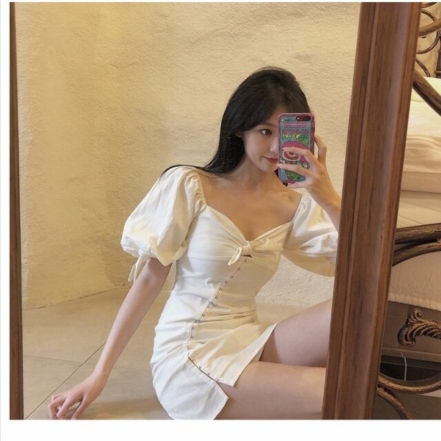クラシカル ワンピース ワンピース 無地 タイト ミニ丈 パフスリーブ 白 オルチャン 韓国ファッション プチプラ