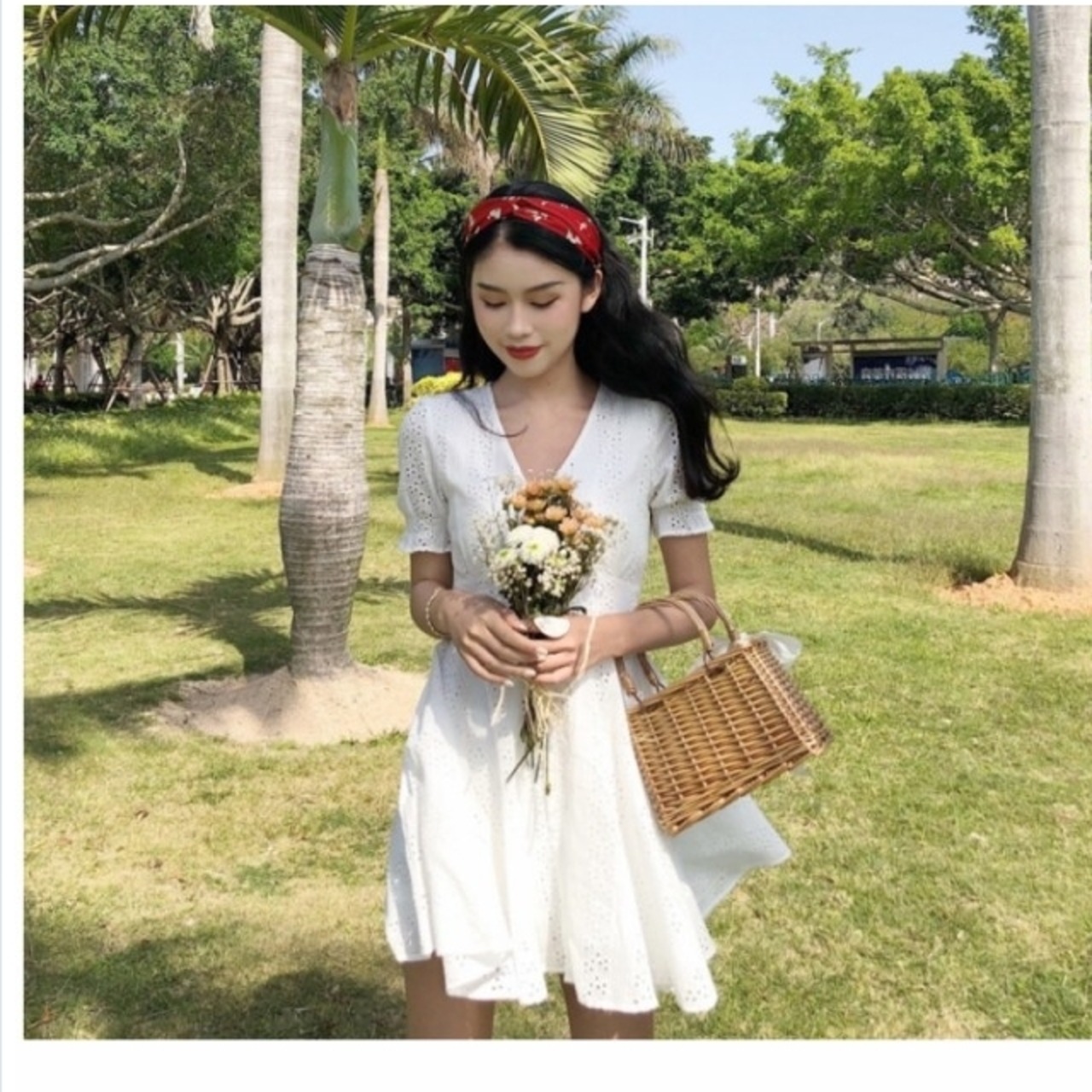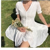 クラシカル ワンピース ワンピース 総レース ミニ丈 パフスリーブ Vネック 白 オルチャン 韓国ファッション プチプラ