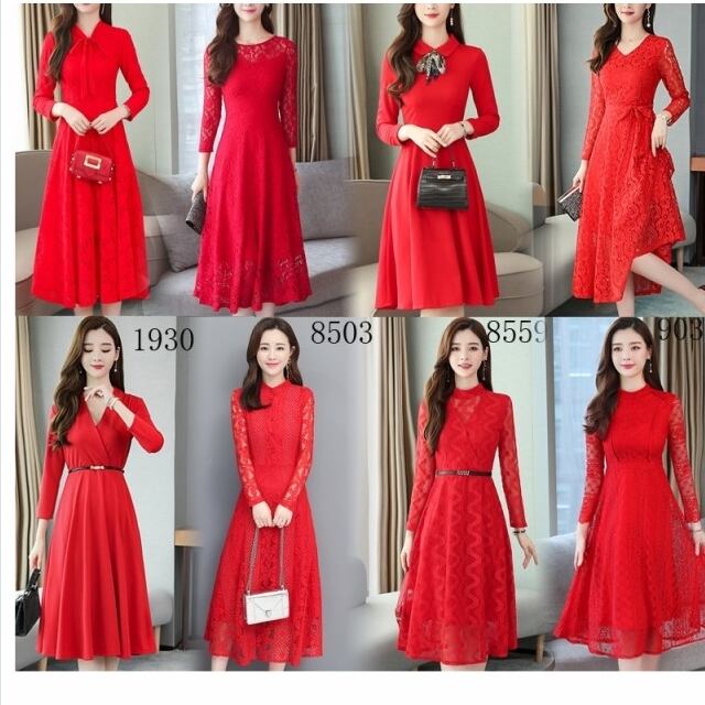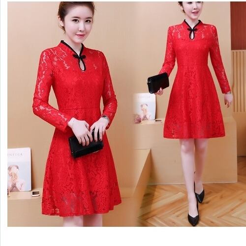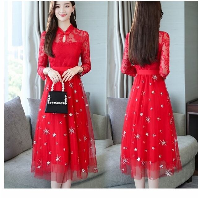 クラシカル ワンピース レースワンピース 長袖 赤 ロング ベルスリープ ネックリボン レースフリル ワンピースドレス お呼ばれ 発表会