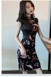 チャイナドレス風 ワンピース チャイナドレス ワンピース チャイナ風服 半袖 ロング丈 着痩せ S M L 3L 4L ブラック 黒い 切り替え