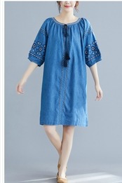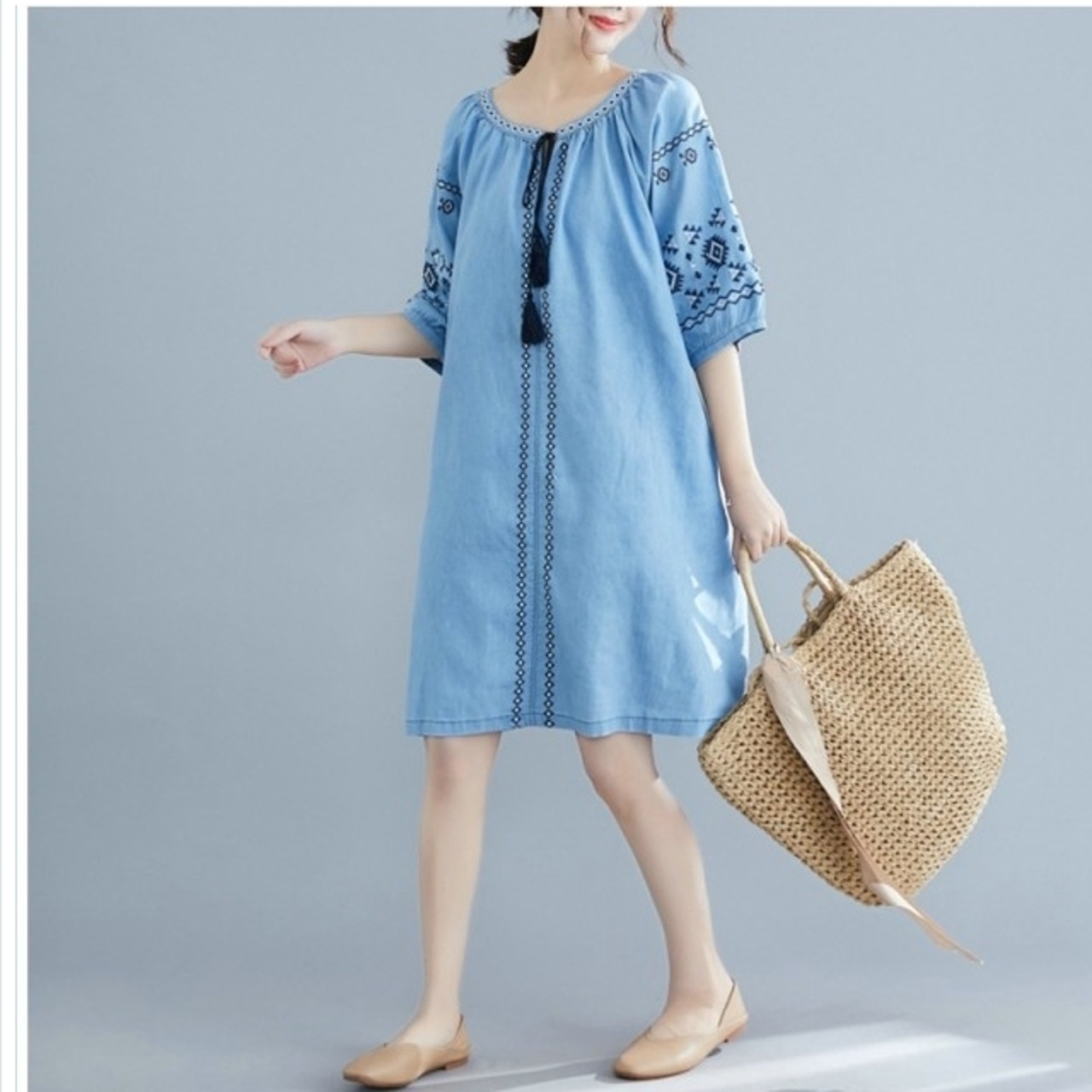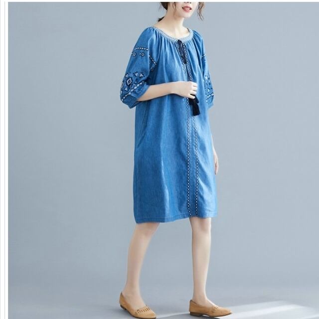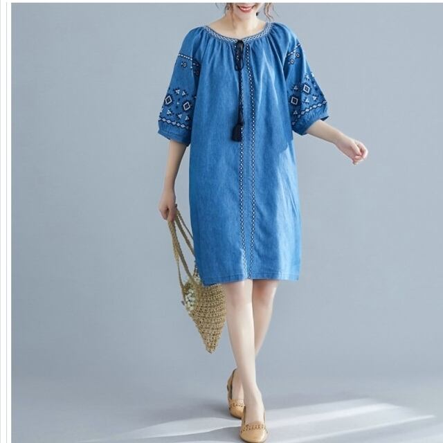 ワンピース 2色展開 刺繍 ワンピース パフスリーブ ワンピース ナチュラル ワンピース デニムワンピース リンネル系 森ガール ワンピース