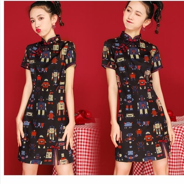 チャイナドレス風 ワンピース チャイナドレス ワンピース チャイナ風服 中華服 スタンドネック 半袖 ショート丈 着痩せ 上品 大きいサイ