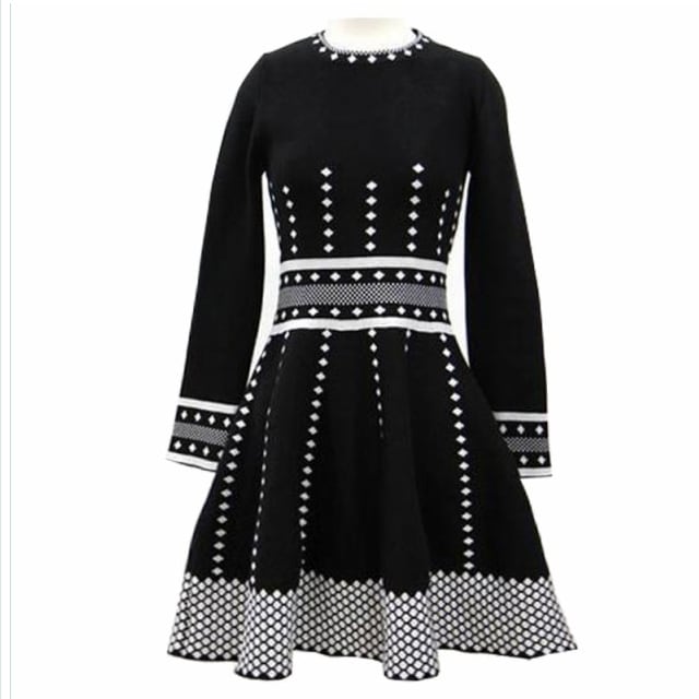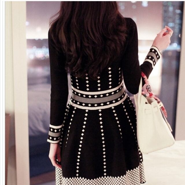 セミ フォーマル ワンピース ワンピース 長袖 ミニ丈 ショート丈 ニットワンピース ミニワンピ フレア ドット柄 水玉 丸首 ラウンドネッ
