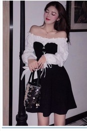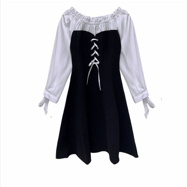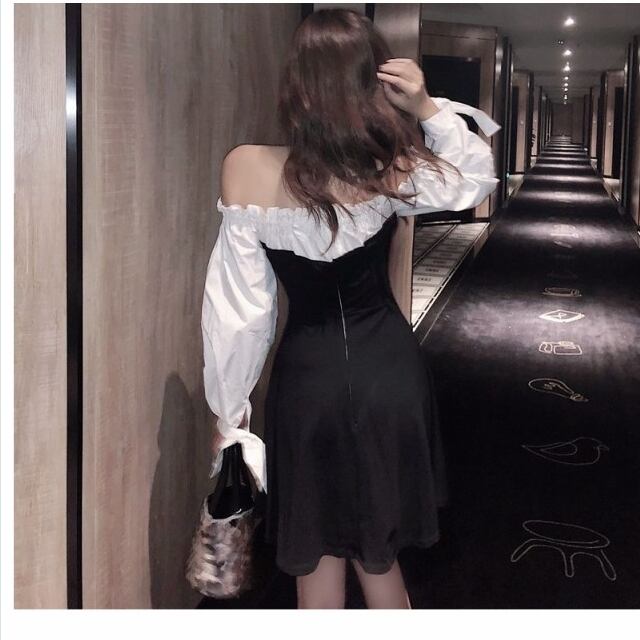 クラシカル ワンピース ワンピース ミニ レディース オフショルダー ハイウエスト Aライン ブラウス レースアップ 長袖 スリム 袖リボン