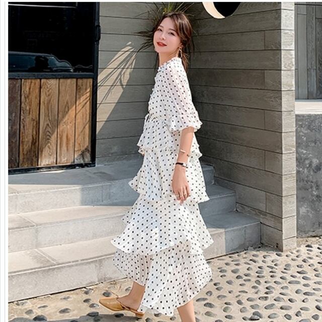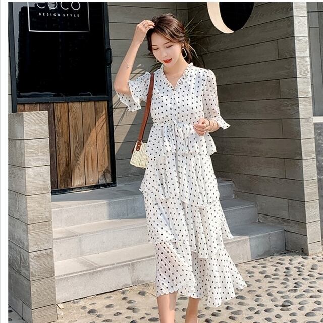 韓国 ファッション レディース 大きいサイズ ワンピース レディース Vネックワンピース 膝下ワンピース ワンピ 水玉 大きいサイズ フレア