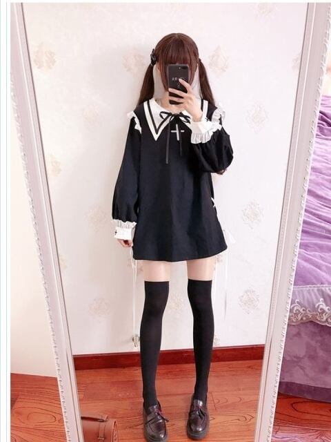 ワンピース ゴスロリ ミニワンピース 十字架 セーラー服少女 クロスリボン 長袖 病み可愛い
