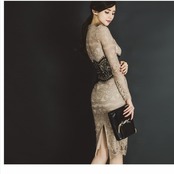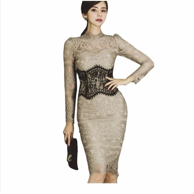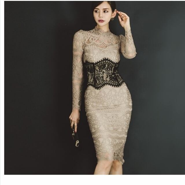 クラシカル ワンピース ワンピース ドレス パーティードレス レディース タイト 総レース 長袖 ハイネック ひざ丈 透け感 シースルー