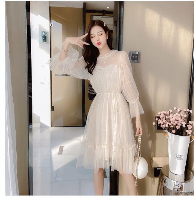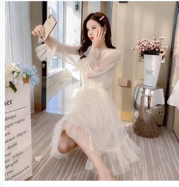セレブ風 ワンピース ワンピース レディース 半袖ワンピース シフォンワンピース ハイウエスト 透け感 メッシュ ベルスリーブ 星柄ワンピ