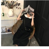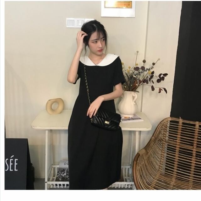 クラシカル ワンピース ワンピース 半袖 ミモレ丈 ロングワンピース 丸首 ラウンドネック 丸襟 Aライン 背中あき バックシャン バックリ