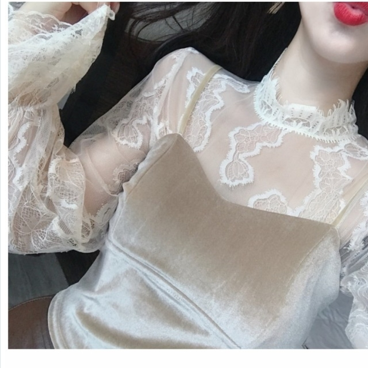 クラシカル ワンピース レース キレイ タイト クラシカル ドッキングワンピース 袖コンシャス フェミニン ボトルネック フレアスリーブ