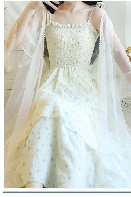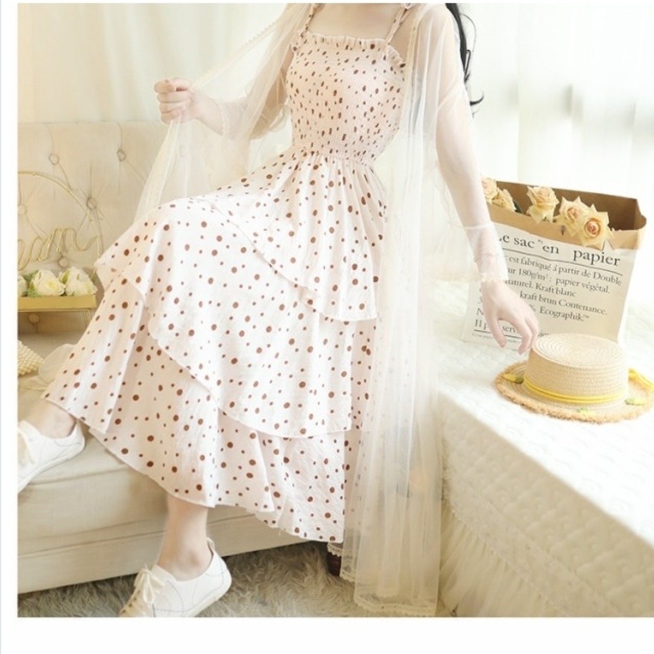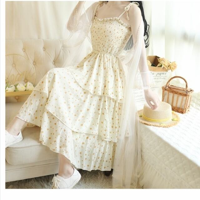 クラシカル ワンピース ワンピース レディース 長袖ワンピース 星柄ワンピース シフォン 透け感 フリル ハイウエスト ラウンドネック