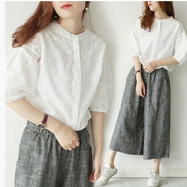 大きいサイズ レディース トップス 半袖 トップス シャツ ブラウス レディース ノーカラー 半袖 白シャツ 花柄 刺繍 ゆったり フリーサイ