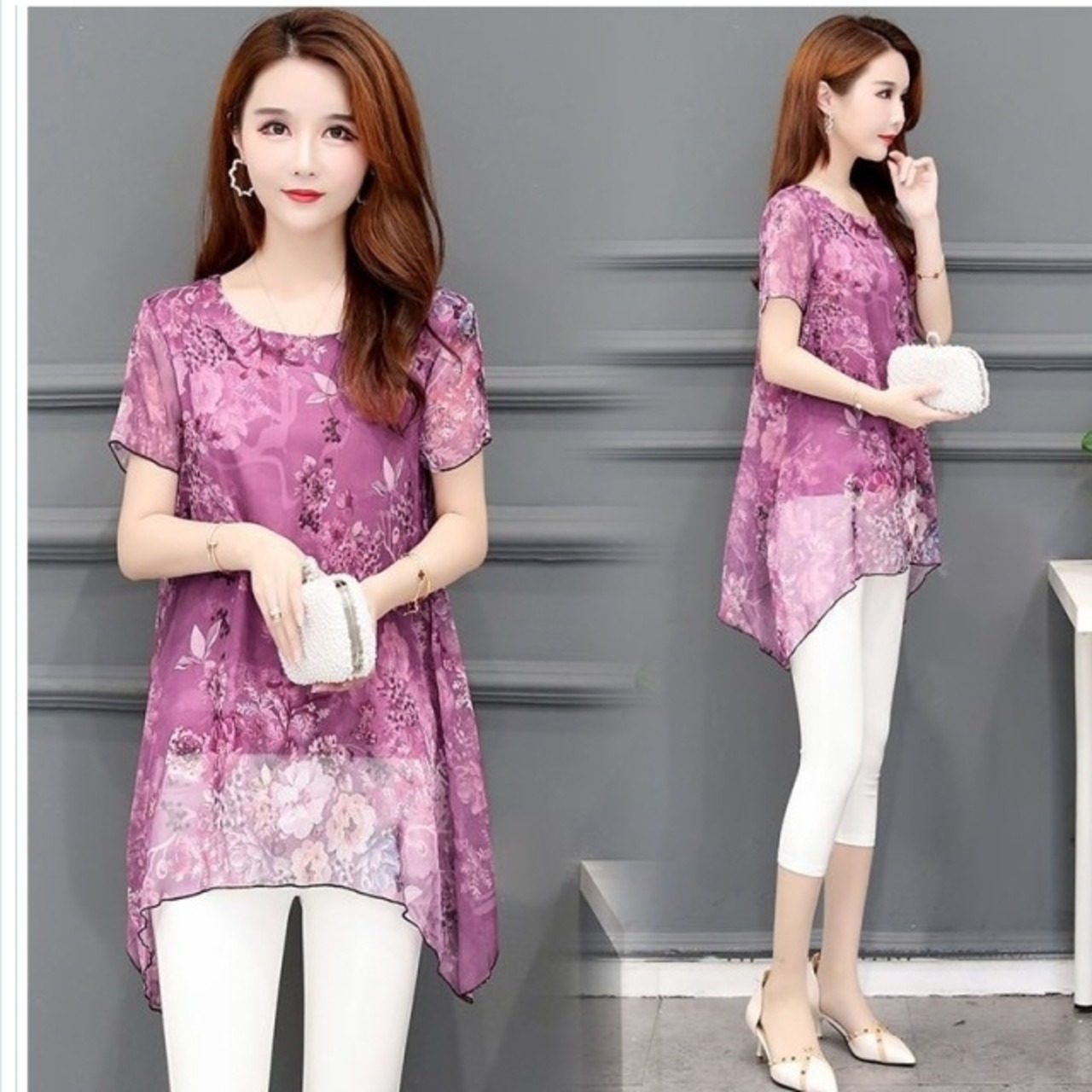 大きいサイズ レディース トップス 半袖 ゆったり エアリーシフォン トップス ラウンドネック 半袖 カットソー シャツ ブラウス 花柄 プ