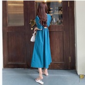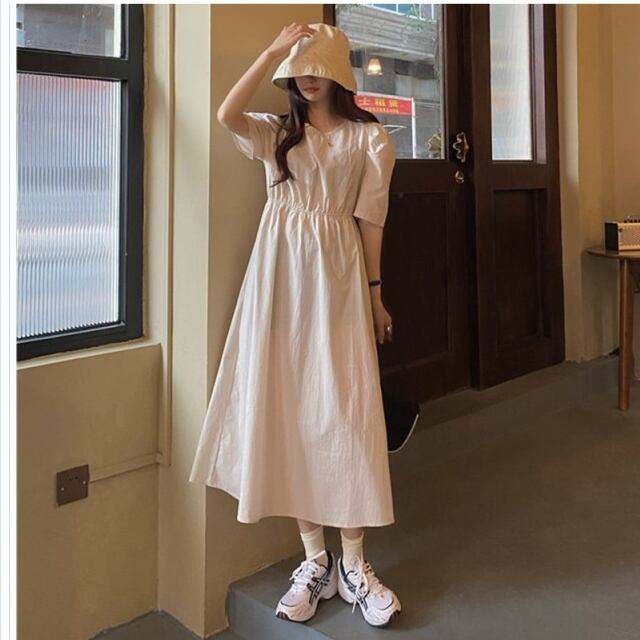 バックリボン ワンピース ワンピース 綿 ミドル丈 半袖 バックリボン ライトグリーン ベージュ 無地 Aライン フレア ラウンドネック レデ