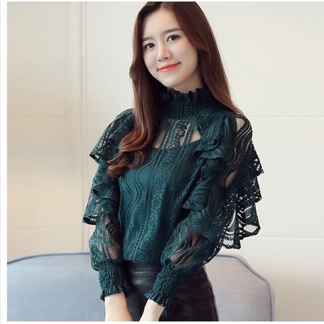 フリルブラウス 韓国 ブラウス シフォン レース スタンドカラー 長袖 フリル袖 無地 体型カバー シースルー 大人可愛い カジュアル フェ