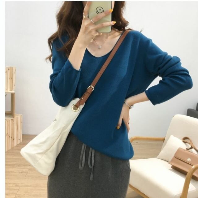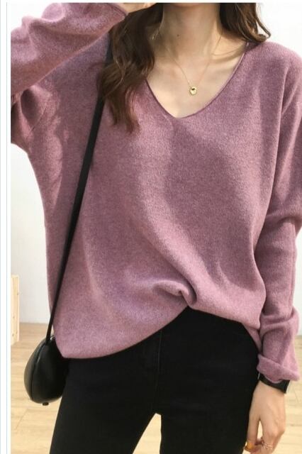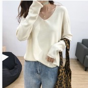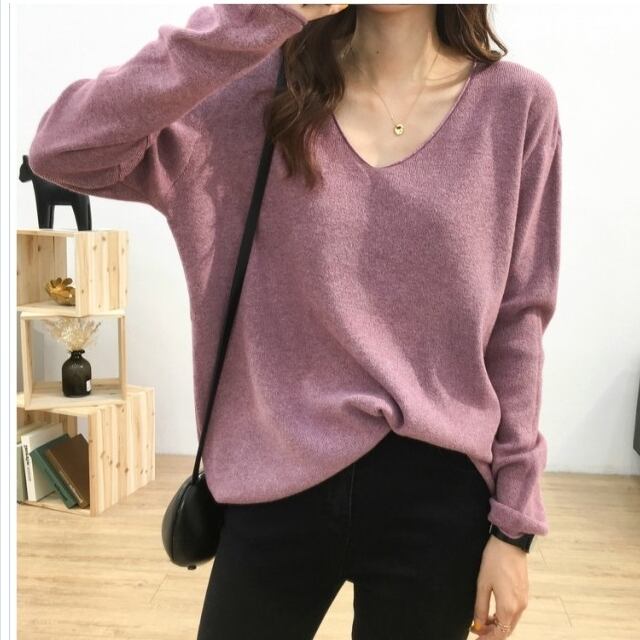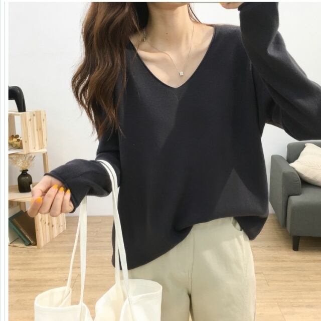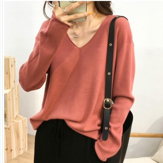 レディース トップス 春夏 セーター ニット Vネック オーバーサイズ 長袖 ボリューム袖 無地 大人可愛い ゆったり カジュアル 韓国ファッ