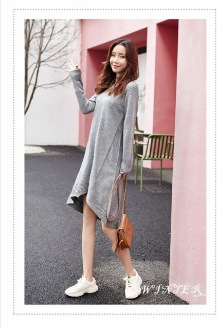 レトロ柄 ワンピース レディース ワンピース ラウンドネック 長袖 ひざ丈 無地 シンプル ゆったり オシャレ 体形カバー サイズ豊富 4色