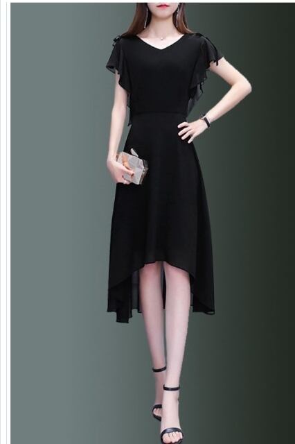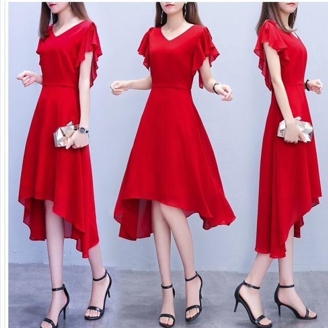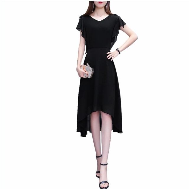 バックリボン ワンピース 無地 半袖 Vネック コットン ショート Aライン ミモレ丈ワンピース ラップスタイル フィッシュテールスカート