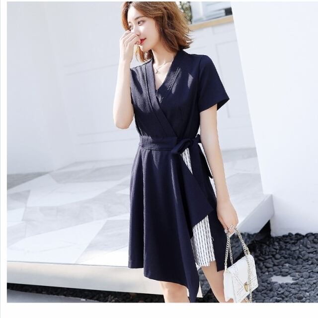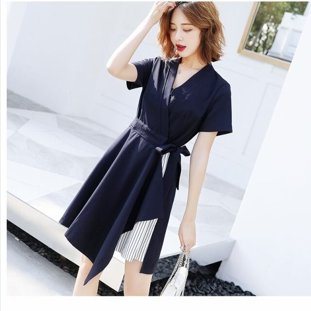 ワンピース ワンピース ロング 春 夏 半袖 レディース ひざ丈 膝上丈 Vネック ウエストマーク ハイウエスト リボン 無地 ストライプ 春フ