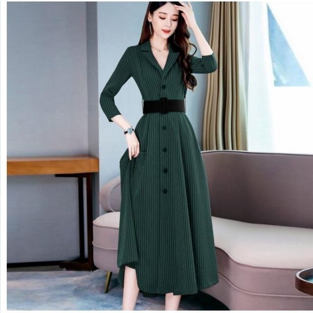 シャツワンピース ロング丈 長袖 ワンピース シャツワンピース ロング丈 ミモレ丈 ストライプ柄 Aライン フレア 長袖 春秋 ベルト