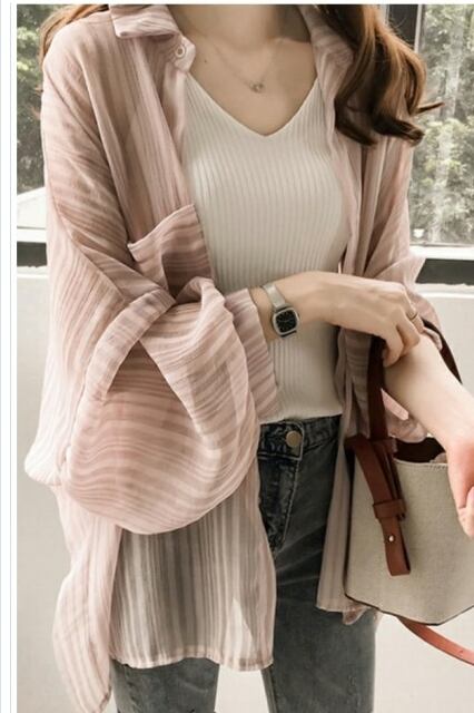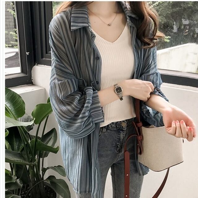 韓国 ファッション レディース トップス セクシー シフォン ブラウス ストライプ トップス UVケア 全3色 MXL