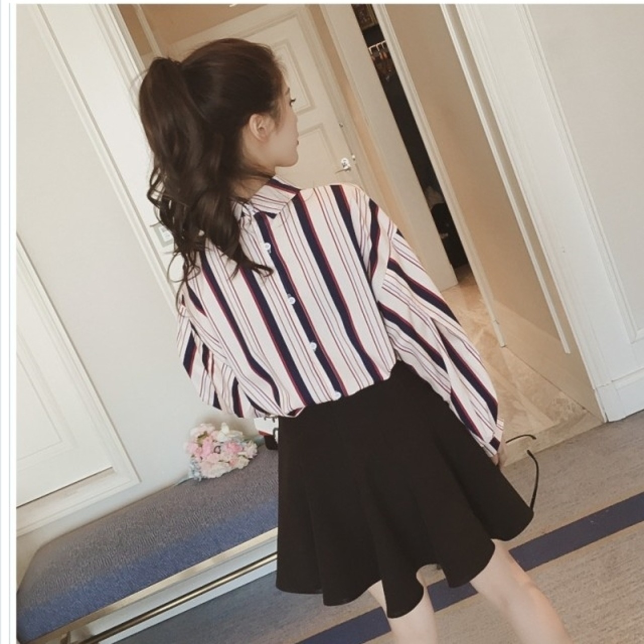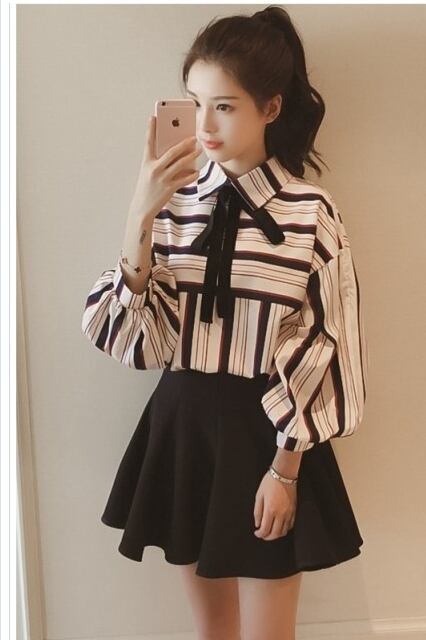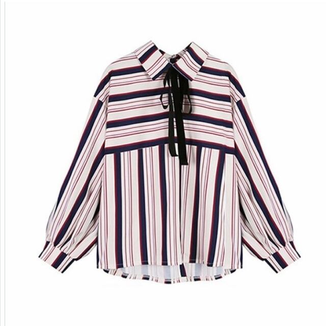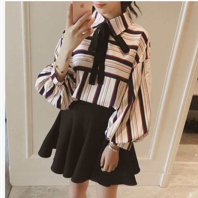 韓国 ファッション レディース 大きいサイズ ブラウス レディース 長袖 シャツ 韓国 ファッション ストライプ ボリューム袖 ボーダー ボ