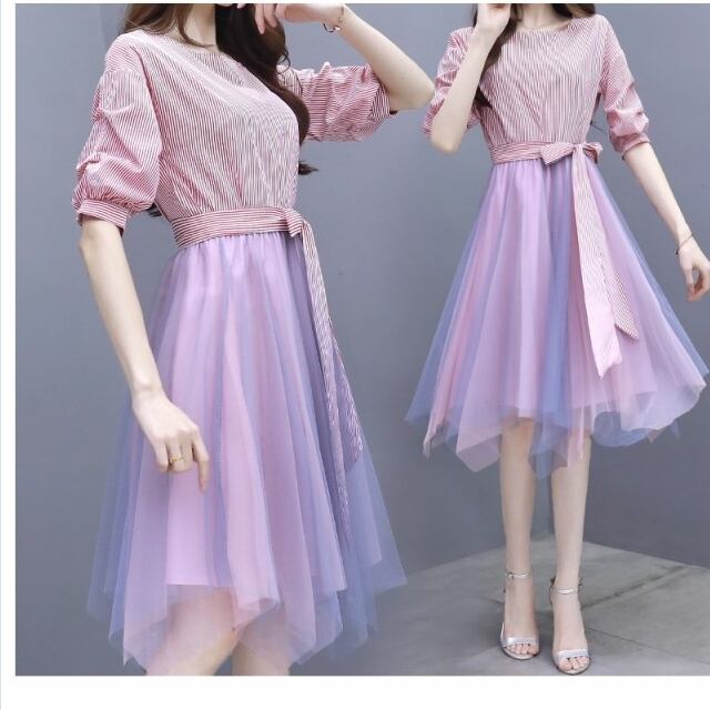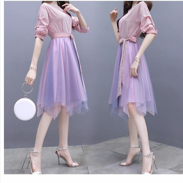 チュールスカート 大きい ワンピース チュール レース ストライプ ひざ丈 半袖 リボン レトロ スーツ スカート 春 夏 2ピース パープル