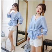 ボリュームタック ストライプ チェック リボン ブラウス シャツ ギンガムチェック ウエストリボン 抜き襟 レディース