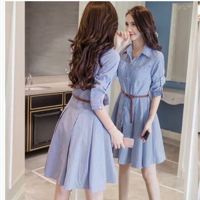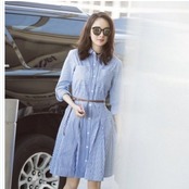 ワンピース ワンピース レディース ストライプ ミモレ丈 シャツフレアワンピース≪ウエストベルトセット≫ 30代 40代 ハーフスリーブ キ