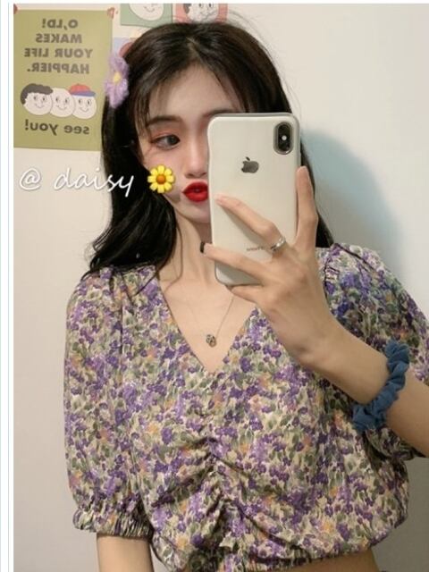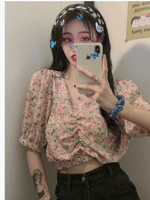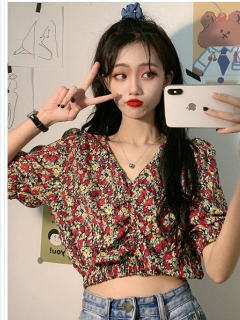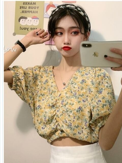 韓国 ファッション レディース トップス セクシー ブラウス レディース 花柄 フリル パール シャツ トップス 花 長袖 きれいめ