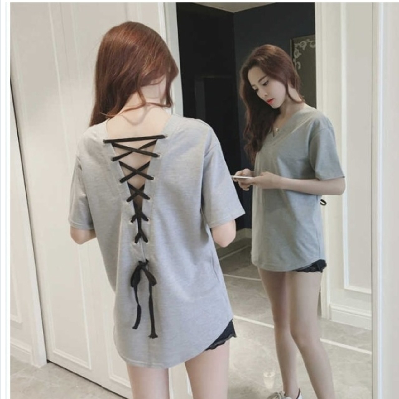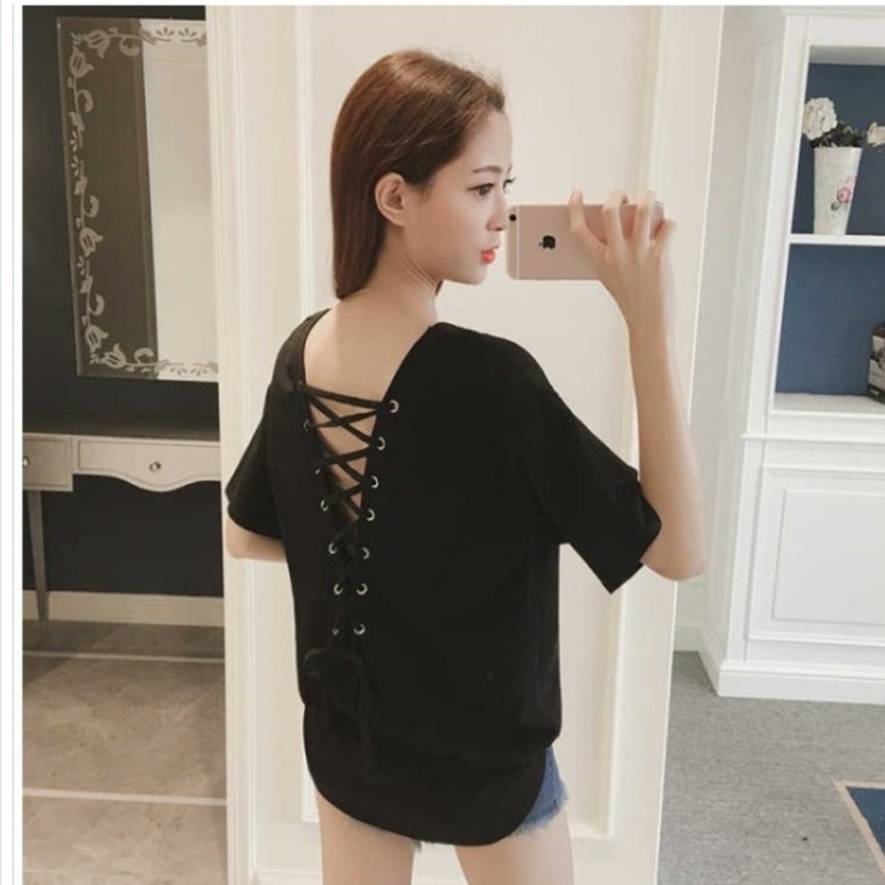韓国 ファッション レディース トップス セクシー 新作 SMLサイズ全2色! バック レースアップ トップス カットソー レディース 半袖
