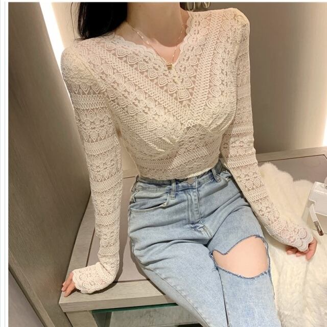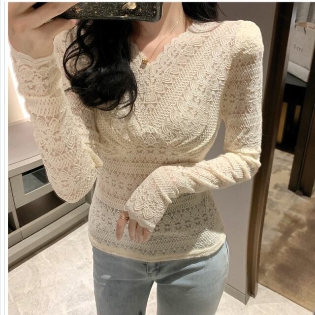 韓国 ファッション レディース トップス セクシー 総レース 長袖 ブラウス シースルー 4T 重ね着 オルチャン 花柄 セクシー タイト Vネッ