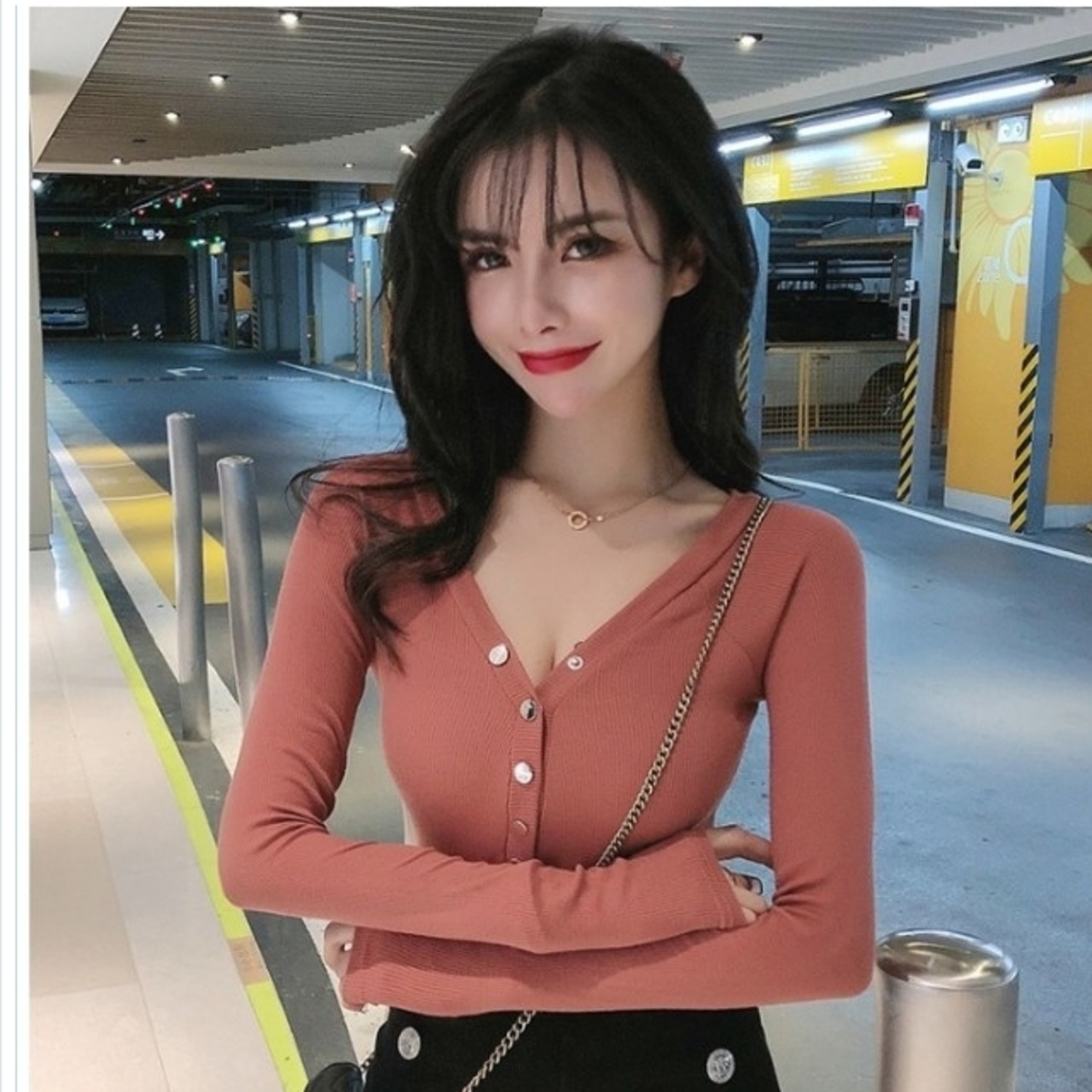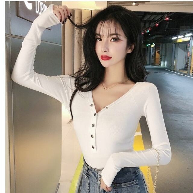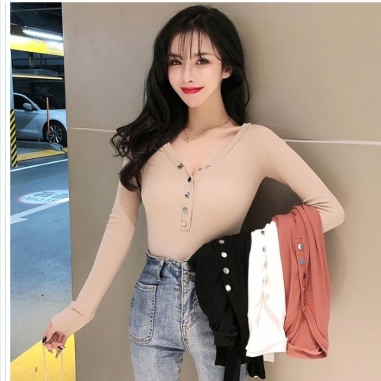 韓国 ファッション レディース トップス セクシー レディース Vネック Tシャツ プルオーバー 春秋 スレンダーライン セクシー タイト カ