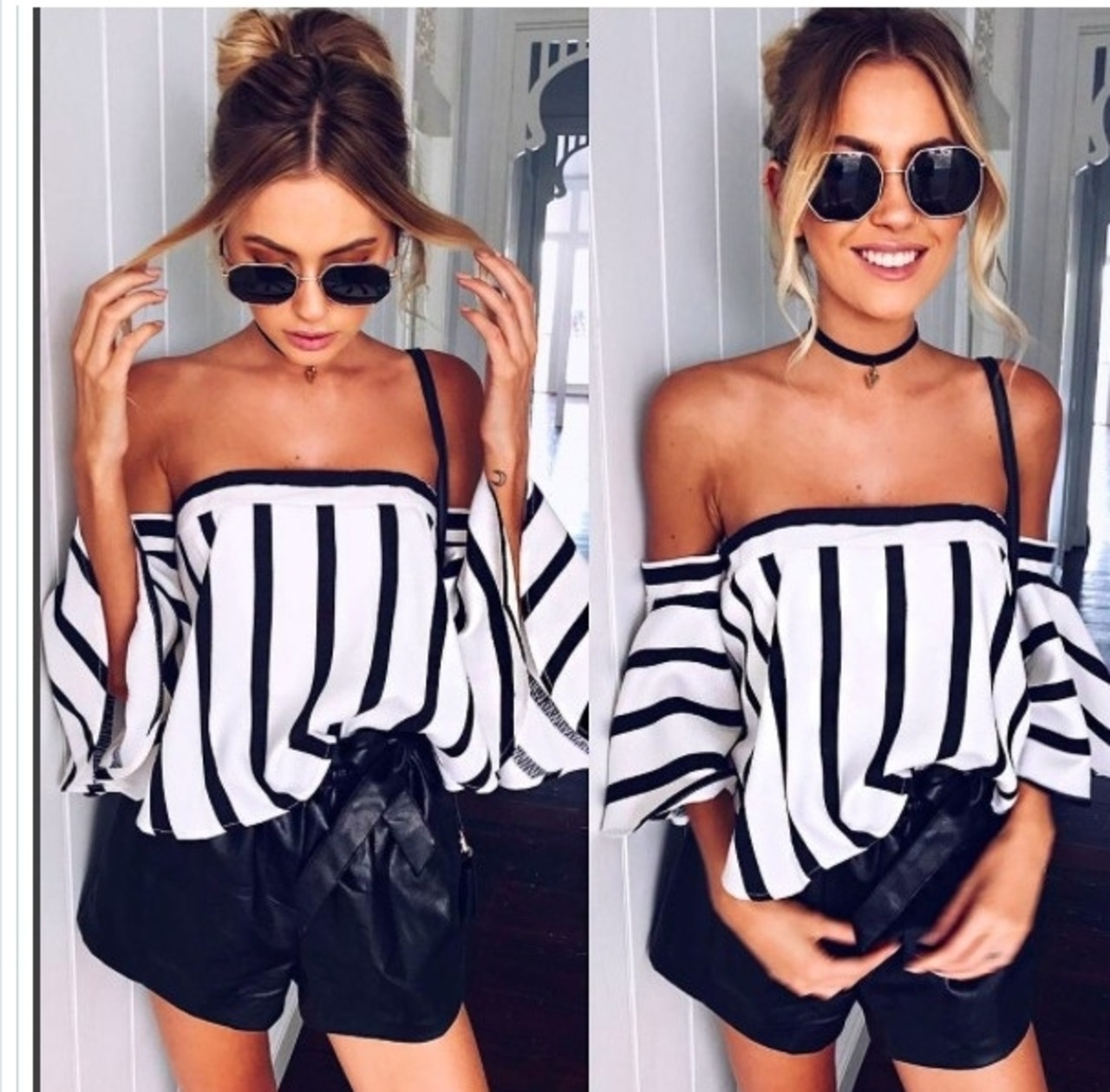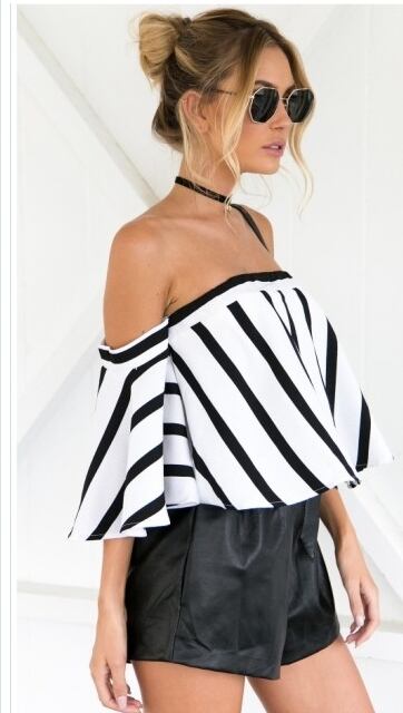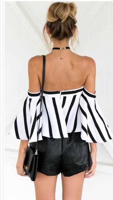 韓国 ファッション レディース トップス セクシー ブラウス レディース オフショル ストライプ ライン トップス 半袖 ふんわり 黒