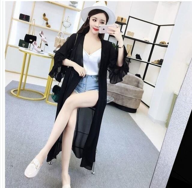 韓国 ファッション レディース トップス セクシー カーディガン シフォン フリル レディース ファッション シフォンカーディガン グリー