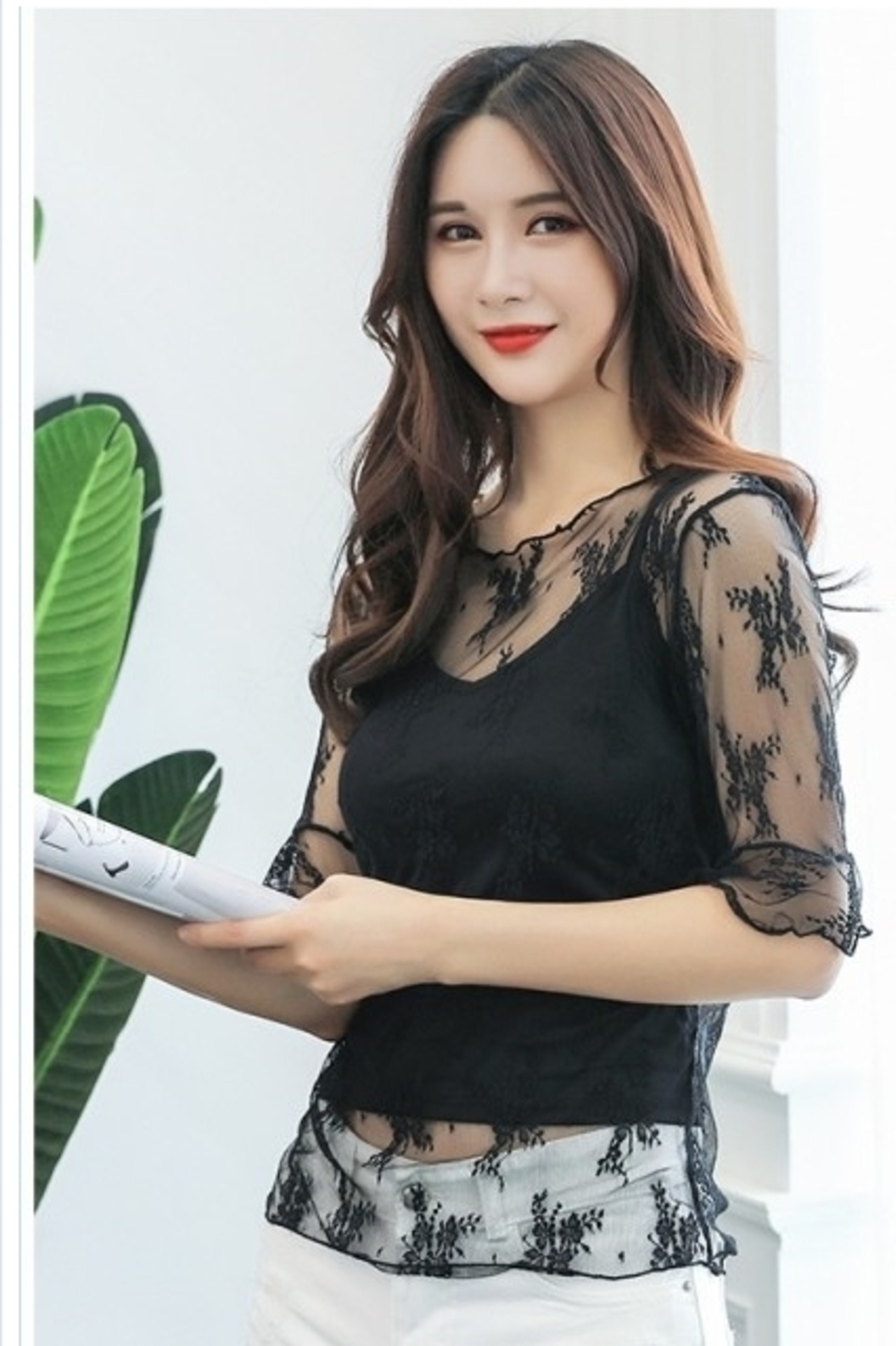 韓国 ファッション レディース トップス セクシー ブラックLサイズ 可愛さ満点 シースルーレースブラウス レディース トップス 大人可愛