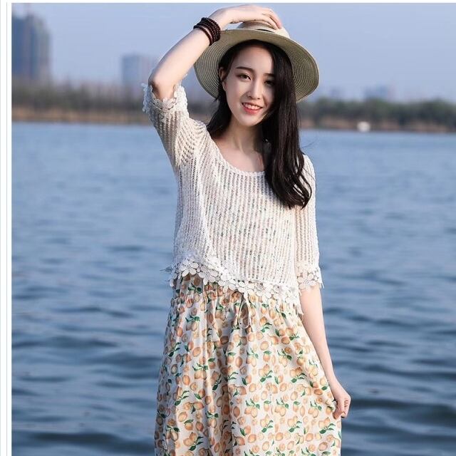 韓国 ファッション レディース トップス セクシー 長袖 サマーニット ショート丈 レース レイヤード 裾レース 袖レース ナチュラル お仕