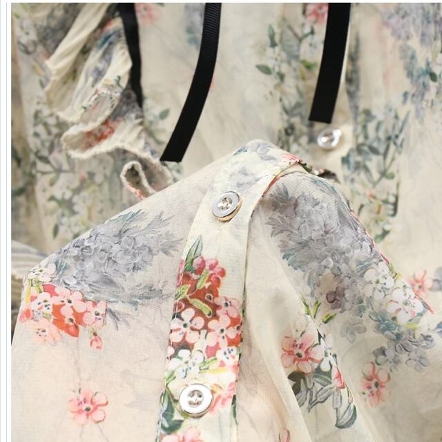 韓国 ファッション レディース トップス セクシー スタンドカラー リボン ボタニカル フローラル 花柄 長袖 秋 フリルネック レディース