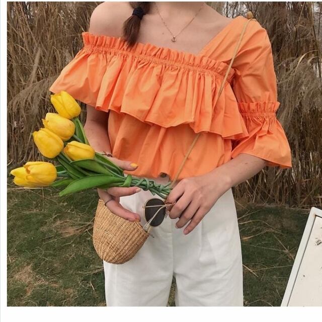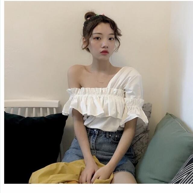 アシンメトリー トップス トップス シャツ オフショルダー ワンショルダー フリル 無地 アシンメトリー 半袖 アンバランスデザイン 春 夏
