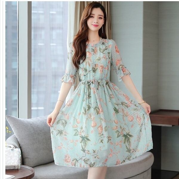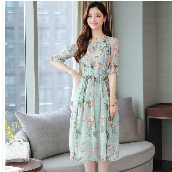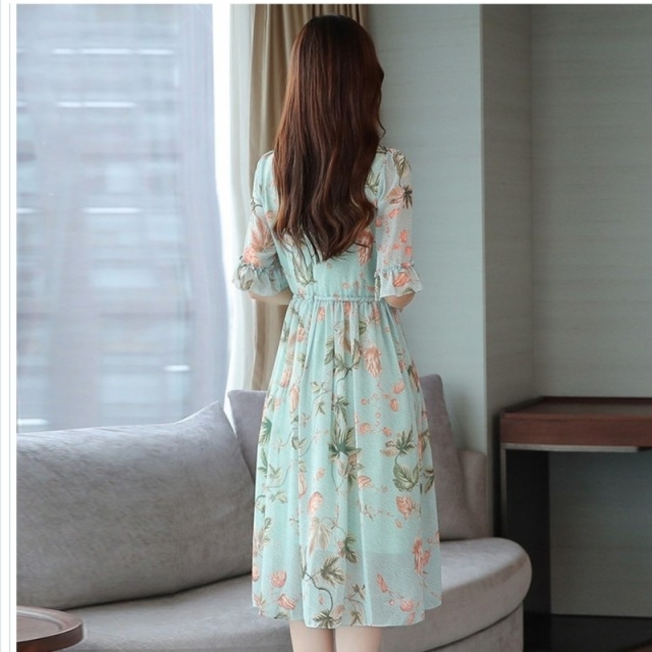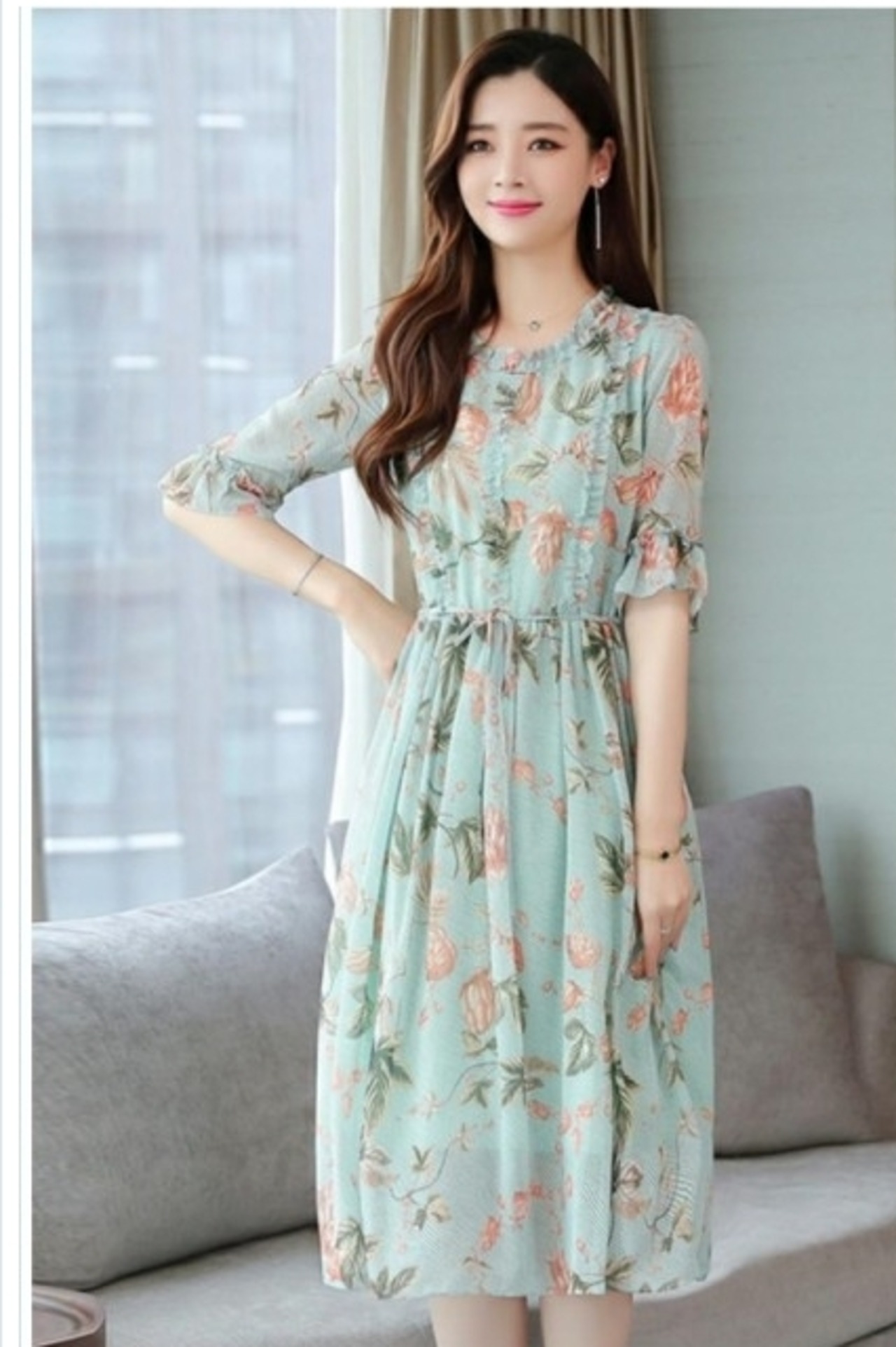 韓国 ファッション レディース ワンピース ミモレ丈 春 夏 花柄 シフォン マキシ丈 おしゃれ フィット&フレアー シアー 透け感 トレンド