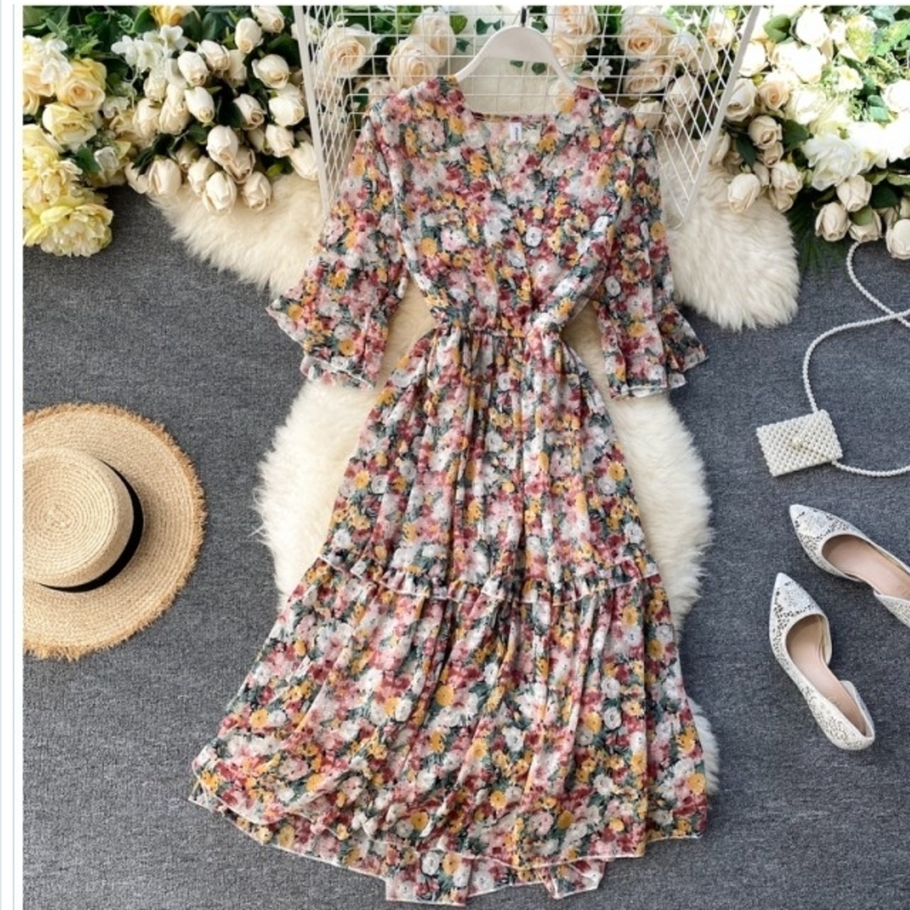 韓国 ファッション レディース 夏新作 大きいサイズ レディース ワンピース 花柄シフォンロングワンピース ワンピ 花柄ワンピース シフォ