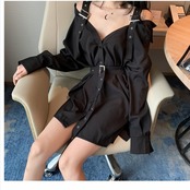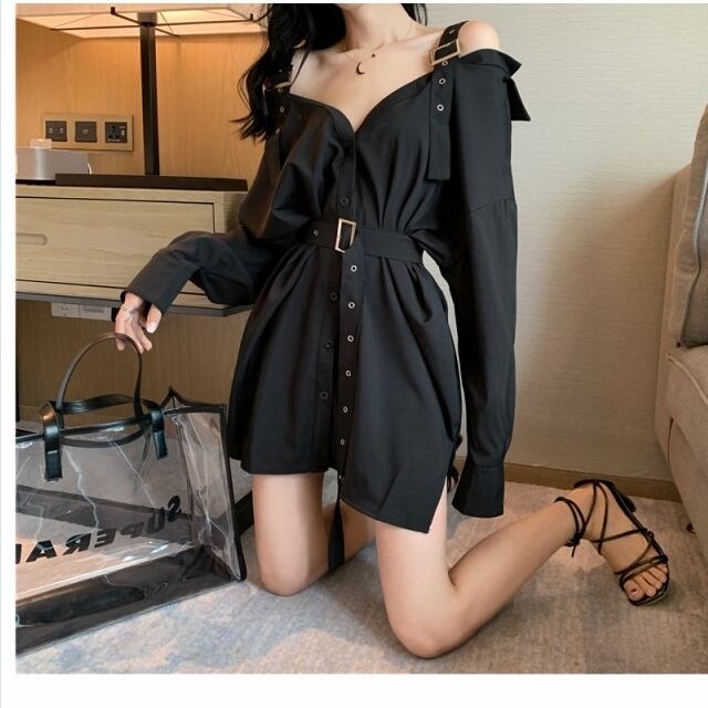 ワンピース ゴスロリ ストラップ ワンピース オフショルダー セクシー 膝丈 ウエストベルト 病み可愛い 原宿系 10代 20代