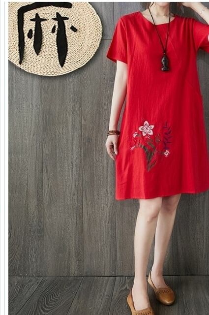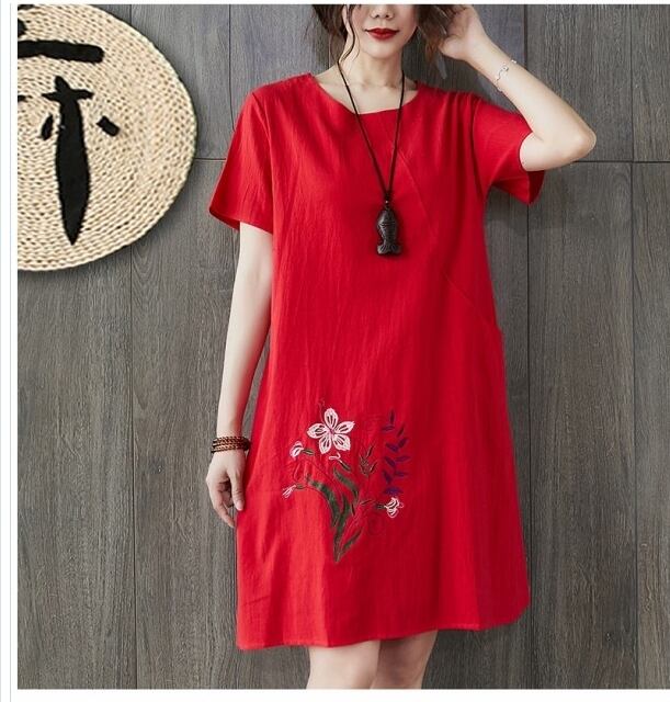韓国 ファッション レディース 秋新着 サワアラモード ボタニカル刺繍のリネンコットン半袖ワンピース レディース ファッション ワンピー