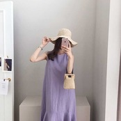 ワンピース クルーネック ロング リネン フリル ノースリーブ 紫 kaz220902