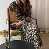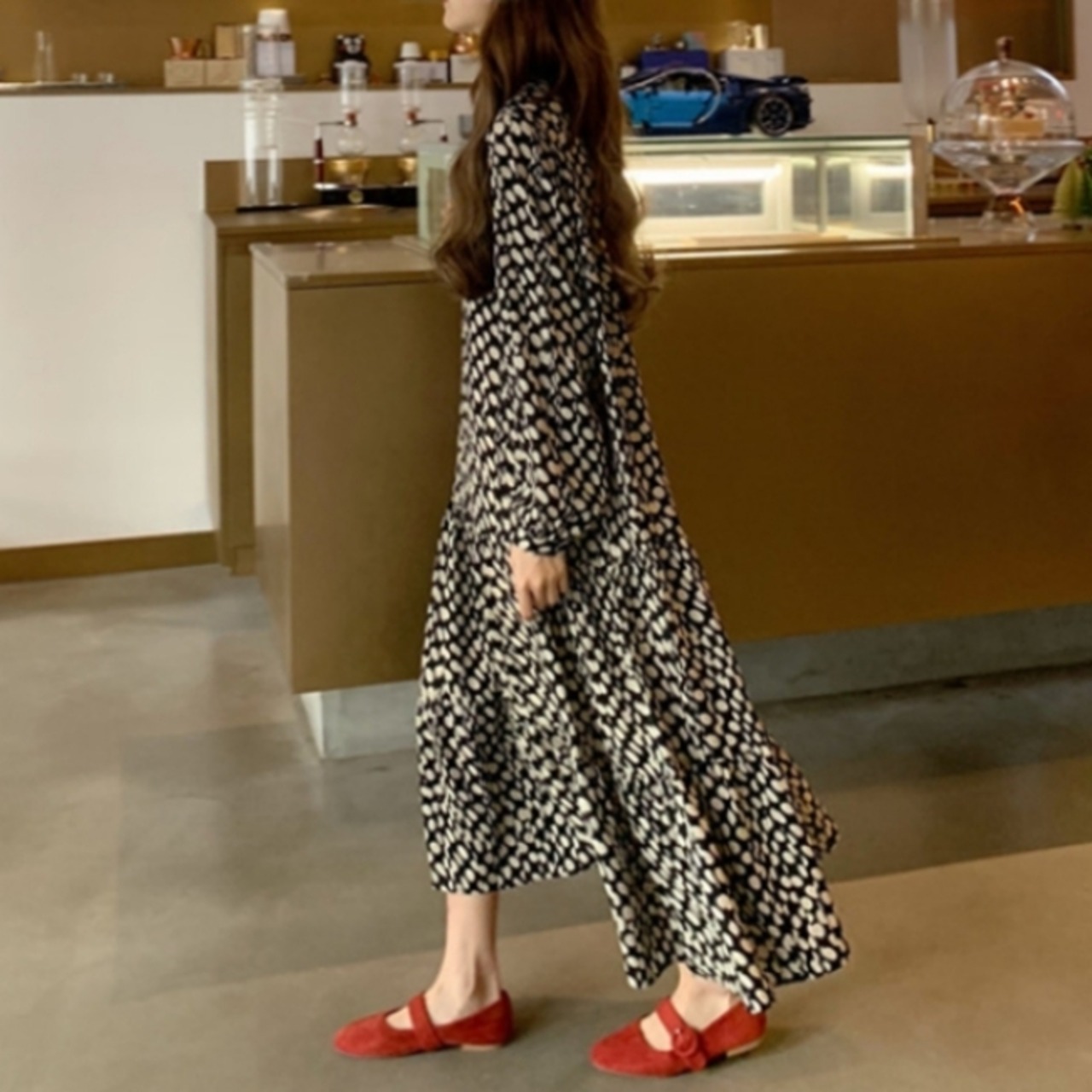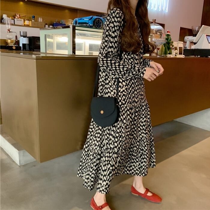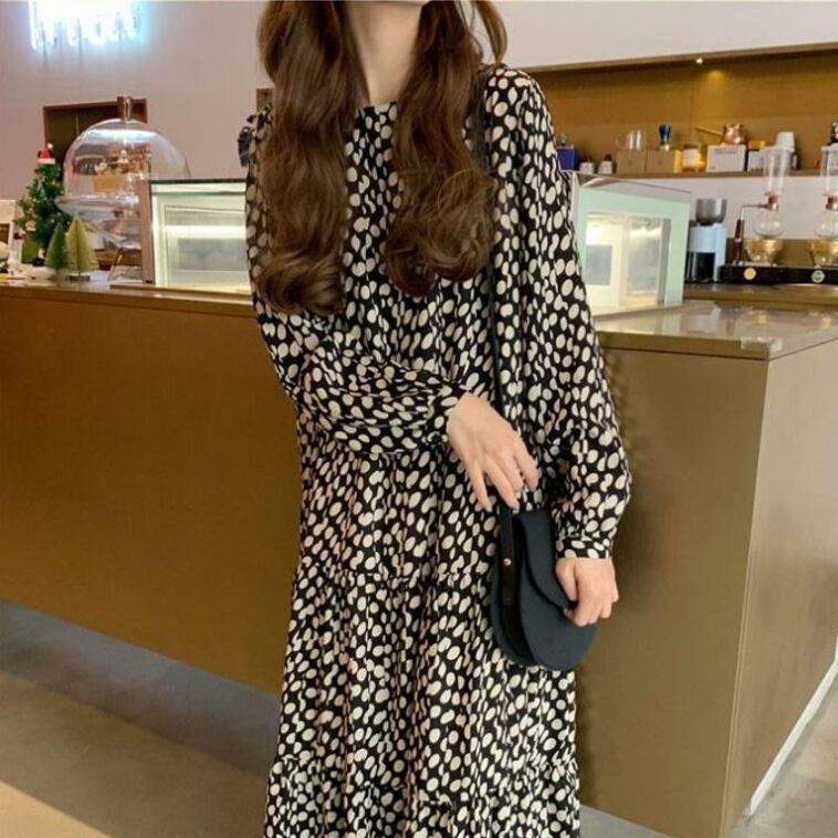 ドット柄 シフォン ティアードワンピース 長袖 フレア Aライン ymk220923
