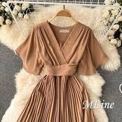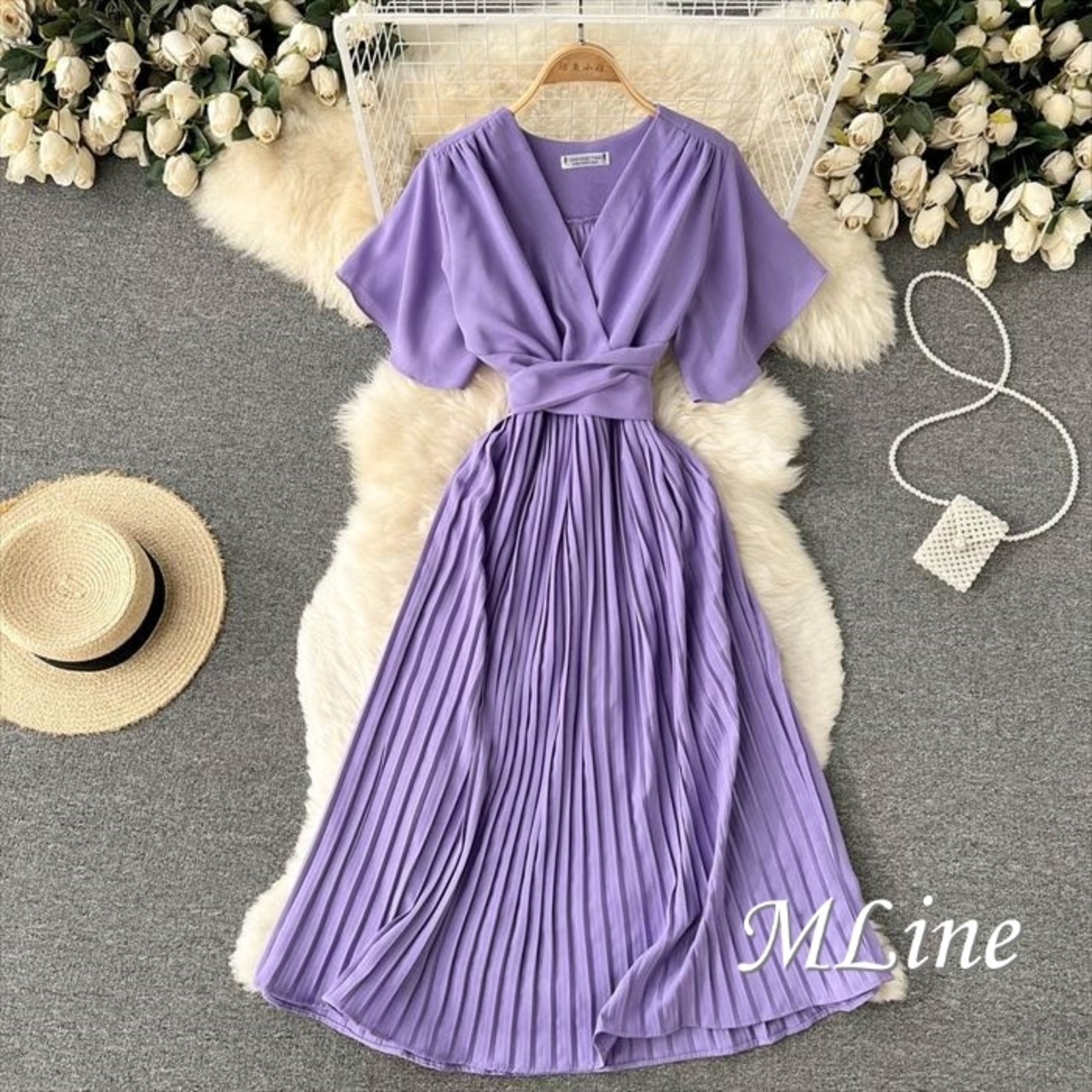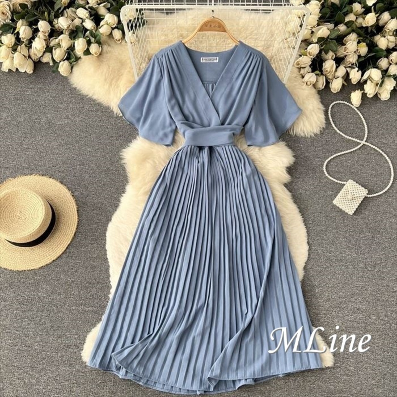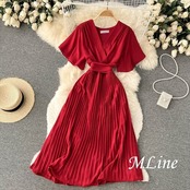 nin220908 カシュクール ワンピース Vネック 切替 プリーツ 紐ベルト 11色