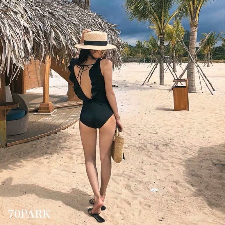 【 背中開き フリル ワンピース 水着 】ブラック yyx220902