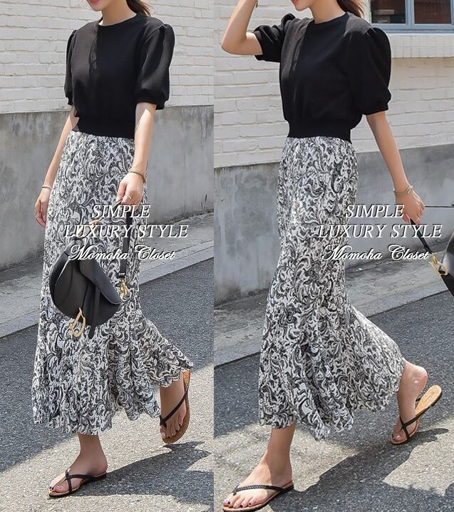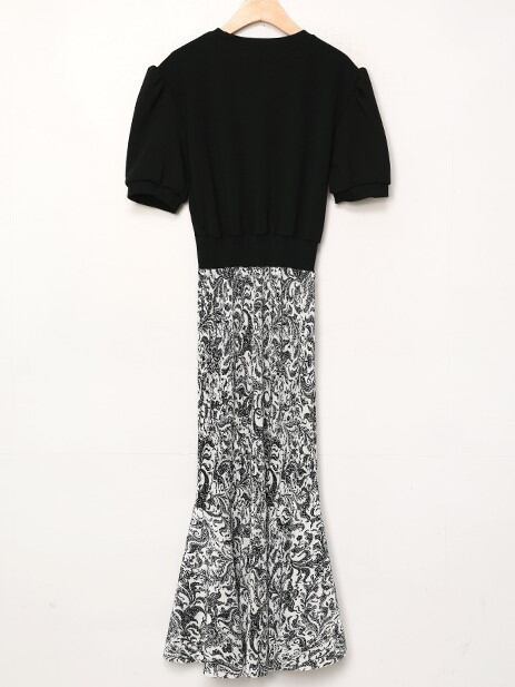 裾フリル ベイズリー柄 シフォン マキシ ワンピース 異素材MIX nin220901