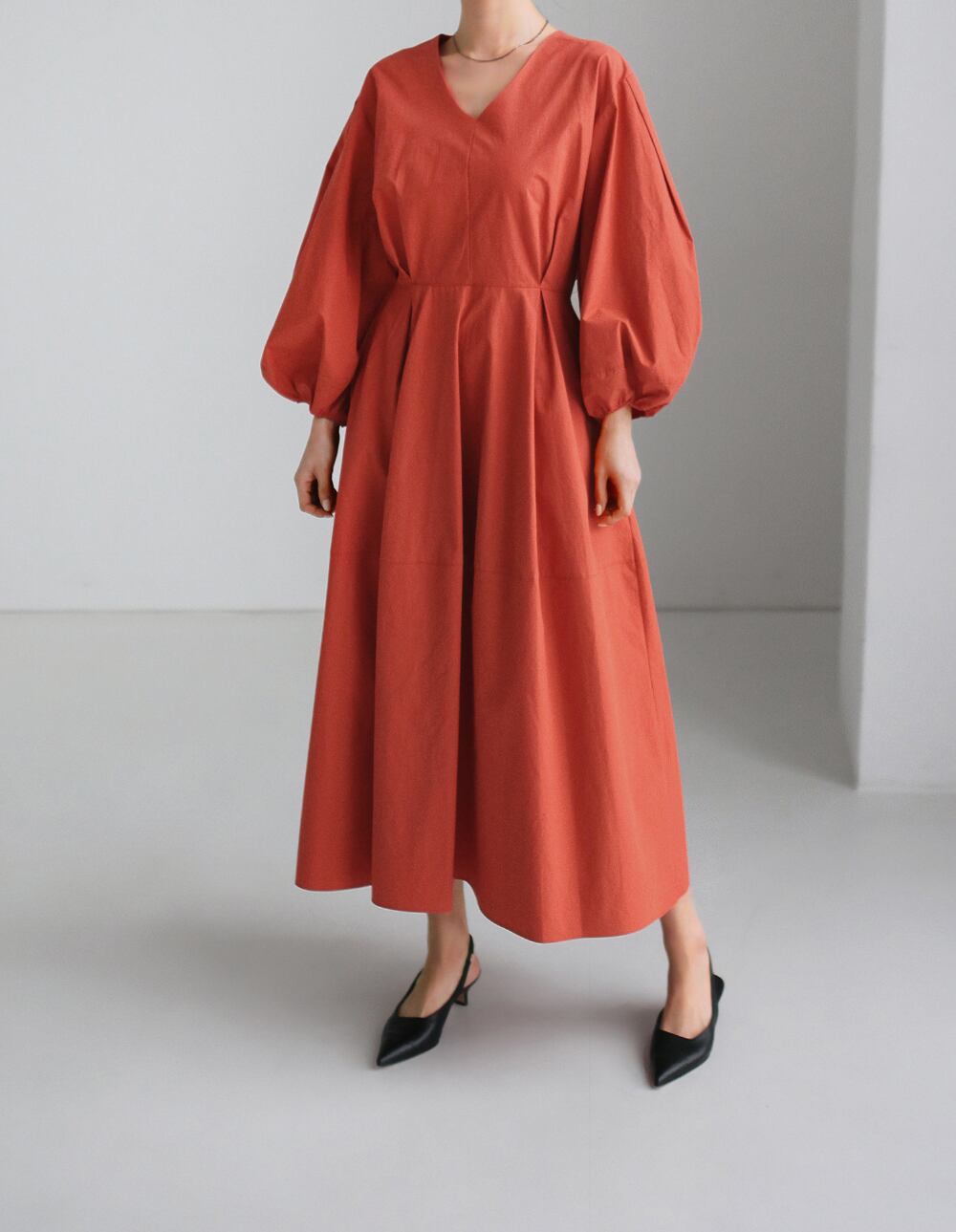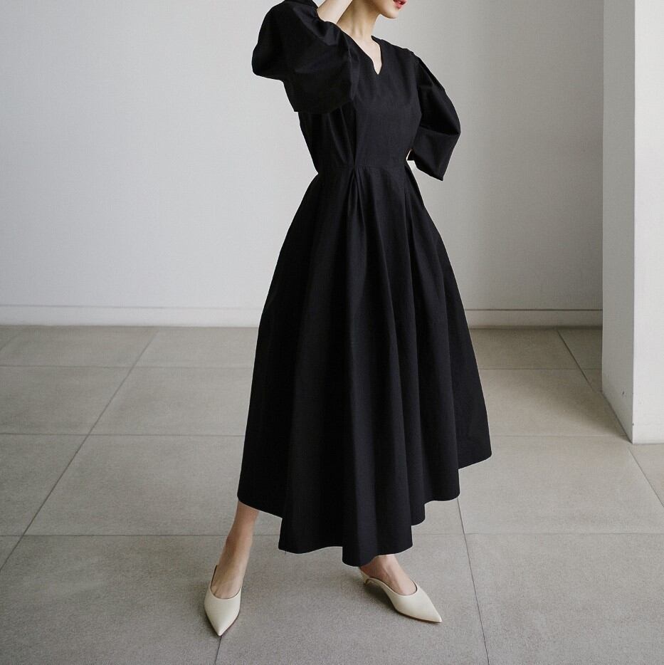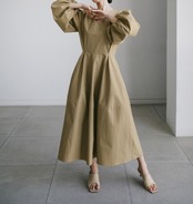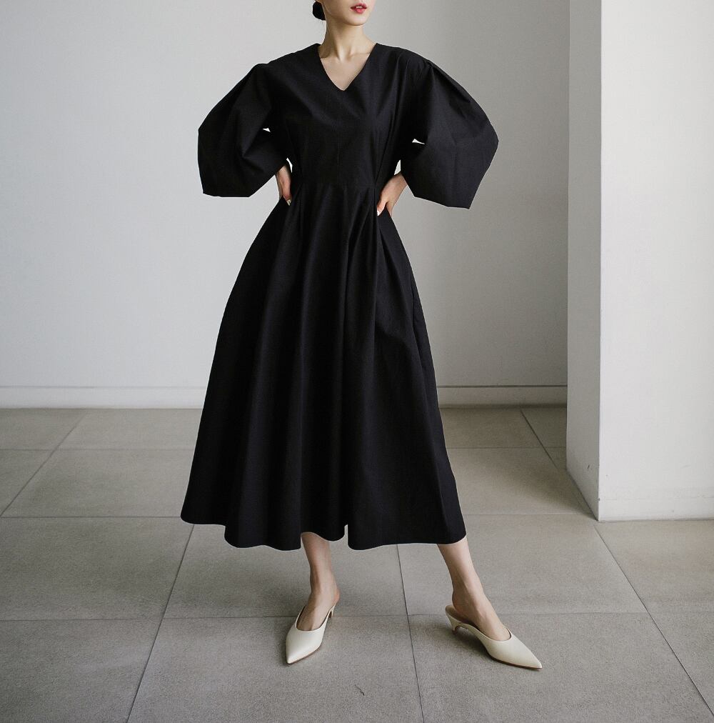 ワンピース ロング ボリューム袖 フレアスカート エレガント 4色 ymk220923